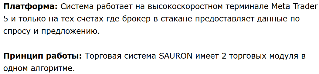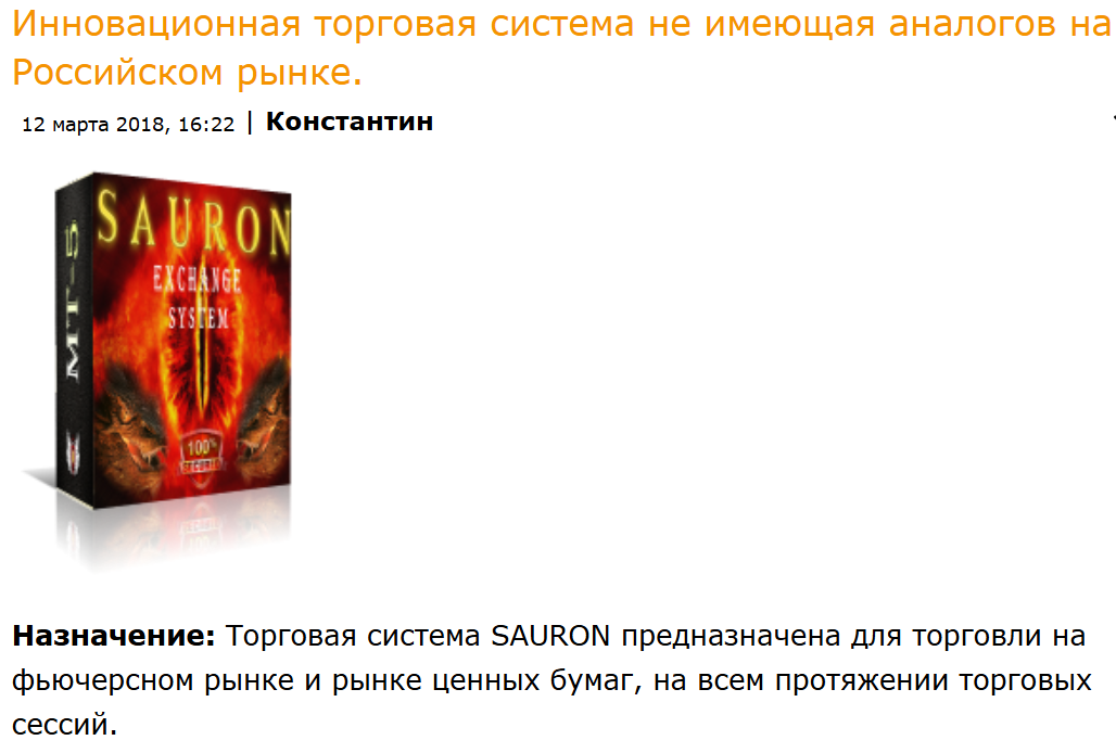 Торговый робот SAURON Exchange system появился в 2017 году. Его предлагали бесплатно скачать на ресурсе Smart Lab, его разработчика зовут Константин (Tramolyr). Он утверждал, что робот занимается автоматическим скальпингом, отталкиваясь от плотностей в стакане.