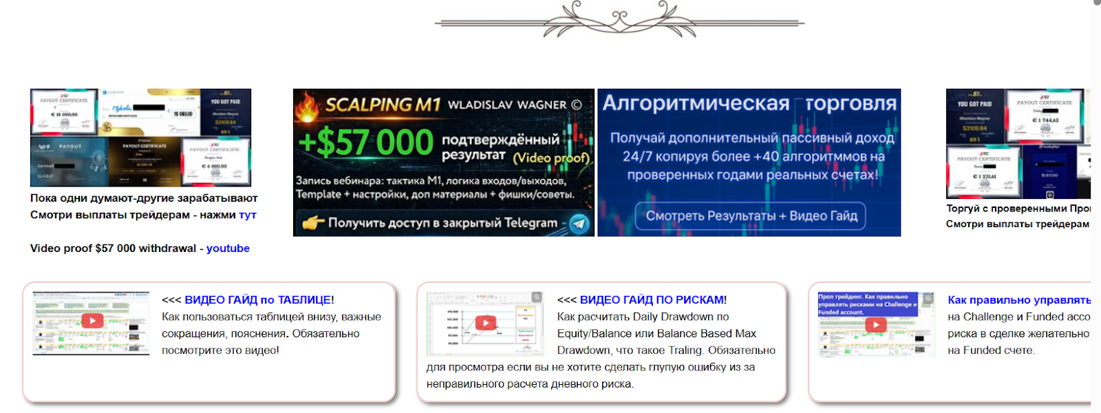 У создателя проекта есть собственный и сайт и ютуб-канал, на котором он рекламирует свои услуги, также создатель «Scalping стратегия для M1 2025» Владислав Вагнер репостит туда свои же видео. На сайте можно ознакомиться с обещаниями Вагнера по заработку от $57,000 по его системе, прочитать о алгоритмической торговле и возможности пассивного дохода. Многий контент доступен в видеоформате.