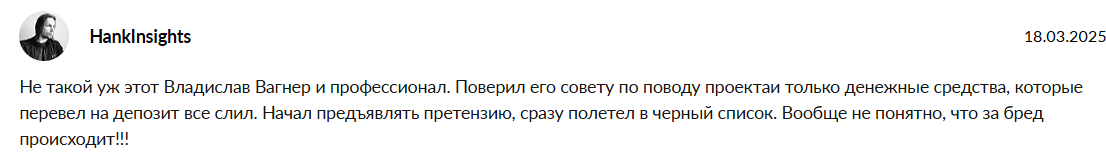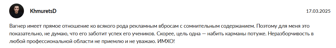 - В отзывах автора называют скамером и говорят, что он сливает депозиты, т.е., подтверждается негативное впечатление о курсах Вагера.