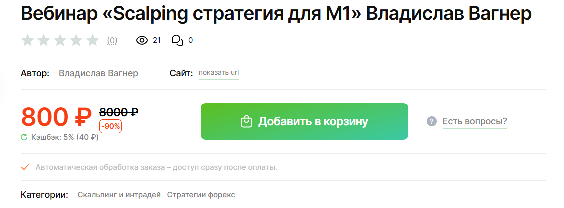 Приобрести курсы для обучения торговле «Scalping стратегия для M1» Владислава Вагнера можно на различных ресурсах, иногда по скидкам. Базовая цена доступа к вебинару составляет ₽8,000, но по акции его можно купить на 90% дешевле всего за ₽800. В магазинах не так много просмотров курсов Владислава, вероятно потому что его не так часто приобретают участники.