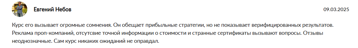 Курсы не оправдывают ожиданий, а реальных прибыльных стратегий Вагнер не предоставляет, как говорят участники. Отсутствие сертификатов у Владислава тоже вызывает недоверие.
