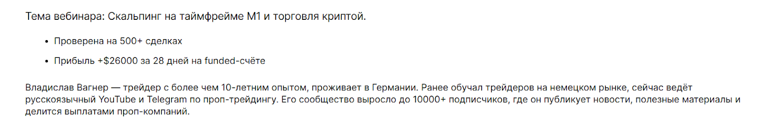 Программа для обучения заработку «Scalping стратегия для M1» от Владислава Вагнера продается на различных площадках с курсами. Владислав обещает прибыль за 28 дней в размере более чем $26,000, система якобы проверена в сотнях сделок. Владислав говорит, что он уже больше десятилетия занимается трейдингом и живет в Германии. Раньше Вагнер обучал трейдеров на немецком рынке, а теперь ведет русскоязычные каналы.