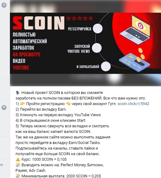 Scoin click — платформа анонимных разработчиков, которая была запущена в 2022 году. Авторы проекта обещали вознаграждение за просмотр видео и другие легкие задания, пользователи якобы могли заказать раскрутку и своего проекта, накопив нужную сумму баланса или инвестировав. Расскажем больше деталей в нашей статье.