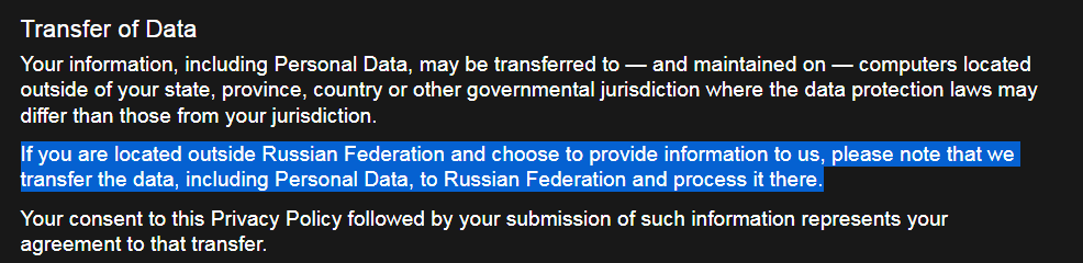 Разработчики указывали на локацию в Российской Федерации, прописывая обработку персональных данных пользователя. Учитывая полное отсутствие доказательств, информация может быть фальшивкой.