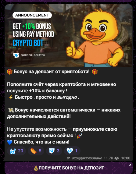 Очередная замануха для лохов: Scratch Official Bot обещает лёгкие деньги, а на деле — анонимные админы и проблемы с выводом средств.
