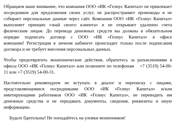 Но вот в чем загвоздка. Единственный официальный сайт ООО ИК Гелиус Капитал — geliuscap ru. Именно там компания прямо предупреждает, что не привлекает посредников, не распространяет промокоды, не собирает персональные данные через сайты и не открывает счета физическим лицам дистанционно. Там же отдельно написано о фиктивных сайтах, использующих реквизиты Гелиус Капитал для имитации надежности.