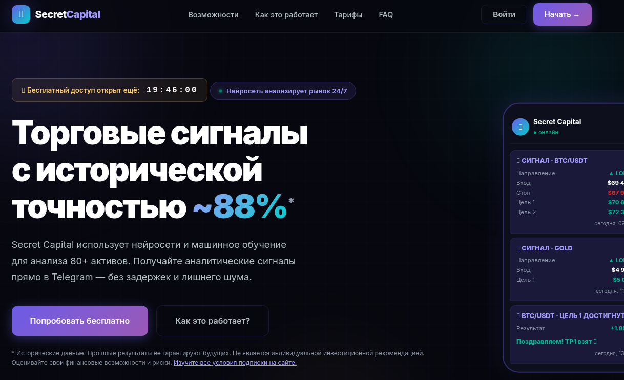 По описанию на сайте secretcapltal ru — автоматизированная система анализа рынков, основанная на машинном обучении. Нейросеть якобы отслеживает 80+ торговых инструментов: криптовалюты, форекс, акции США, российские бумаги, европейские акции, сырьевые товары и индексы. Сигнал включает точку входа, уровень Stop Loss и несколько целей Take Profit. Все это приходит в Телеграм-бот с задержкой 38 миллисекунд — так написано на сайте.