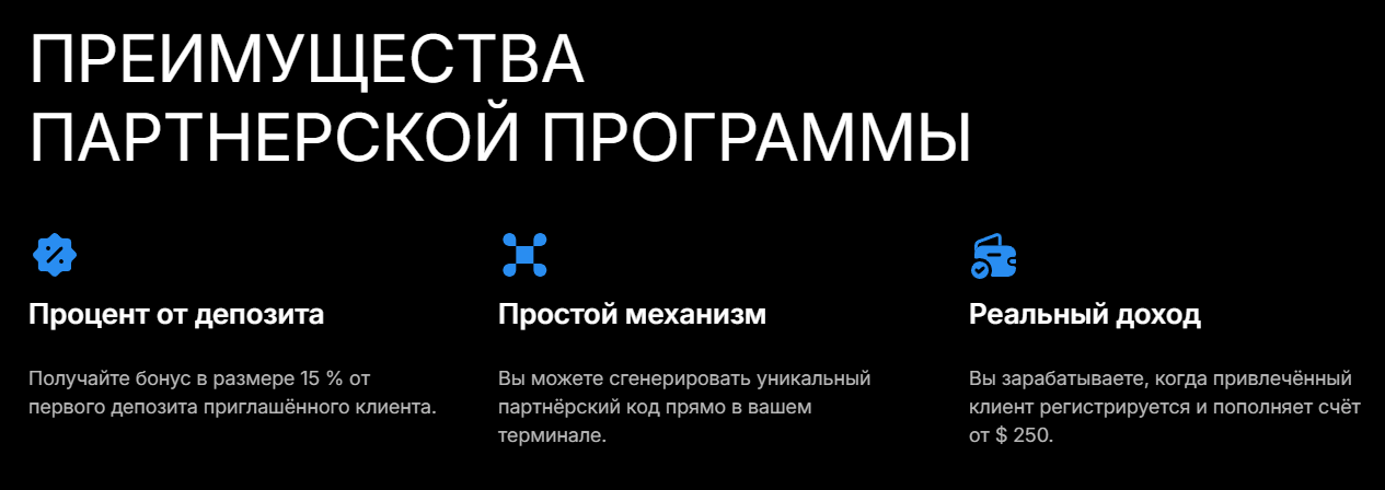 Увеличить свой заработок можно благодаря партнерской программе. Система автоматически начислит 15% первого депозита реферала от $250.