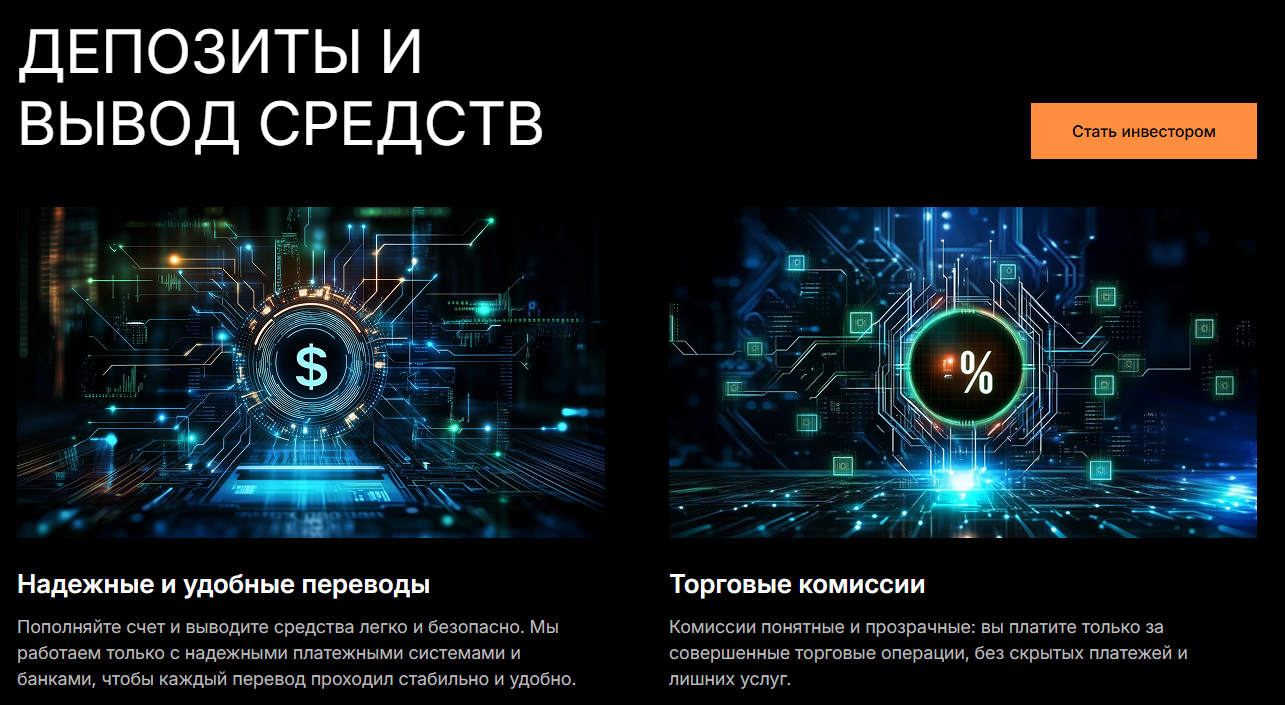 Команда обещает клиентам надежные и удобные способы перевести деньги между цифровыми счетами, а также прозрачные торговые комиссии без скрытых платежей. Конкретных цифр нет, из-за чего пользователи не могут оценить преимущества работы через брокера.