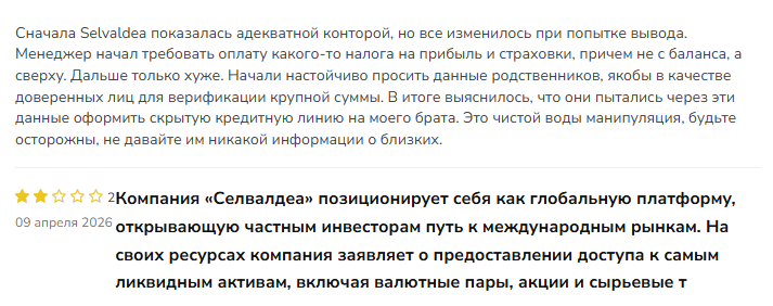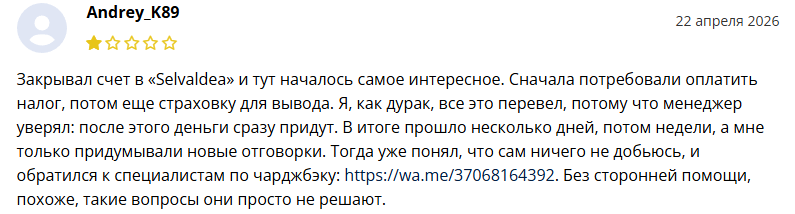 Roman1971 в своем отзыве посчитал платформу Selvaldea com мошеннической из-за невозможности вывести прибыль с платежного счета. Юзера убеждали отправить обеспечительный платеж, чтобы менеджер дал добро на вывод.