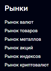 На первую половину 2026 года для трейдинга доступны рынки Forex, сырьевых товаров и металлов, а также акций, крипты и индексов.