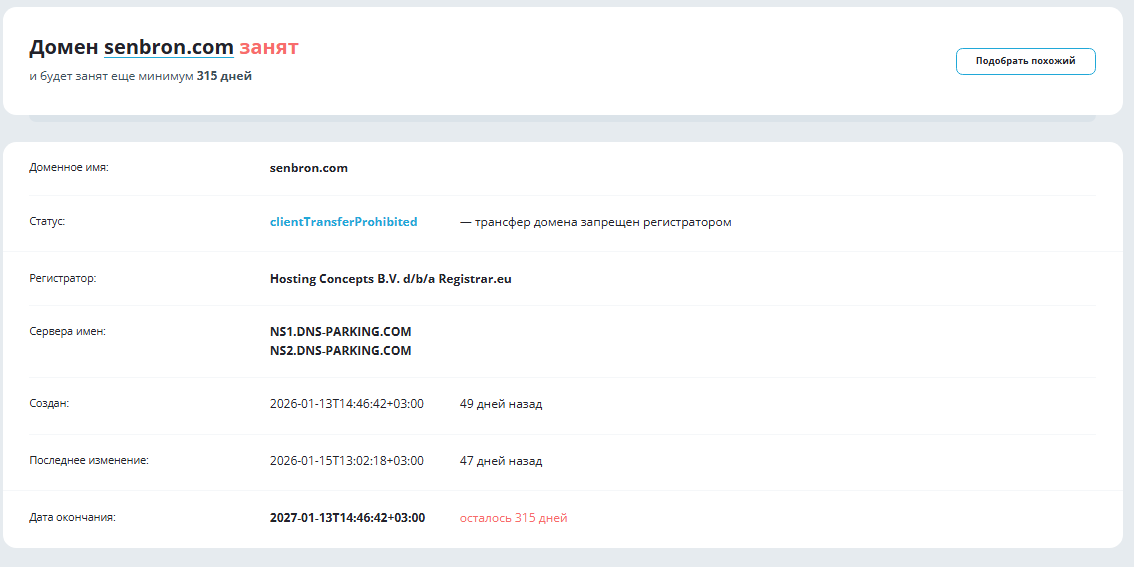 Домен «Сенброн» также оказался подозрительным, поскольку был зарегистрирован в начале 2026 года и существует всего 49 дней. Компания совсем недавно на рынке, не отличается стабильностью и не может называться опытным игроком.