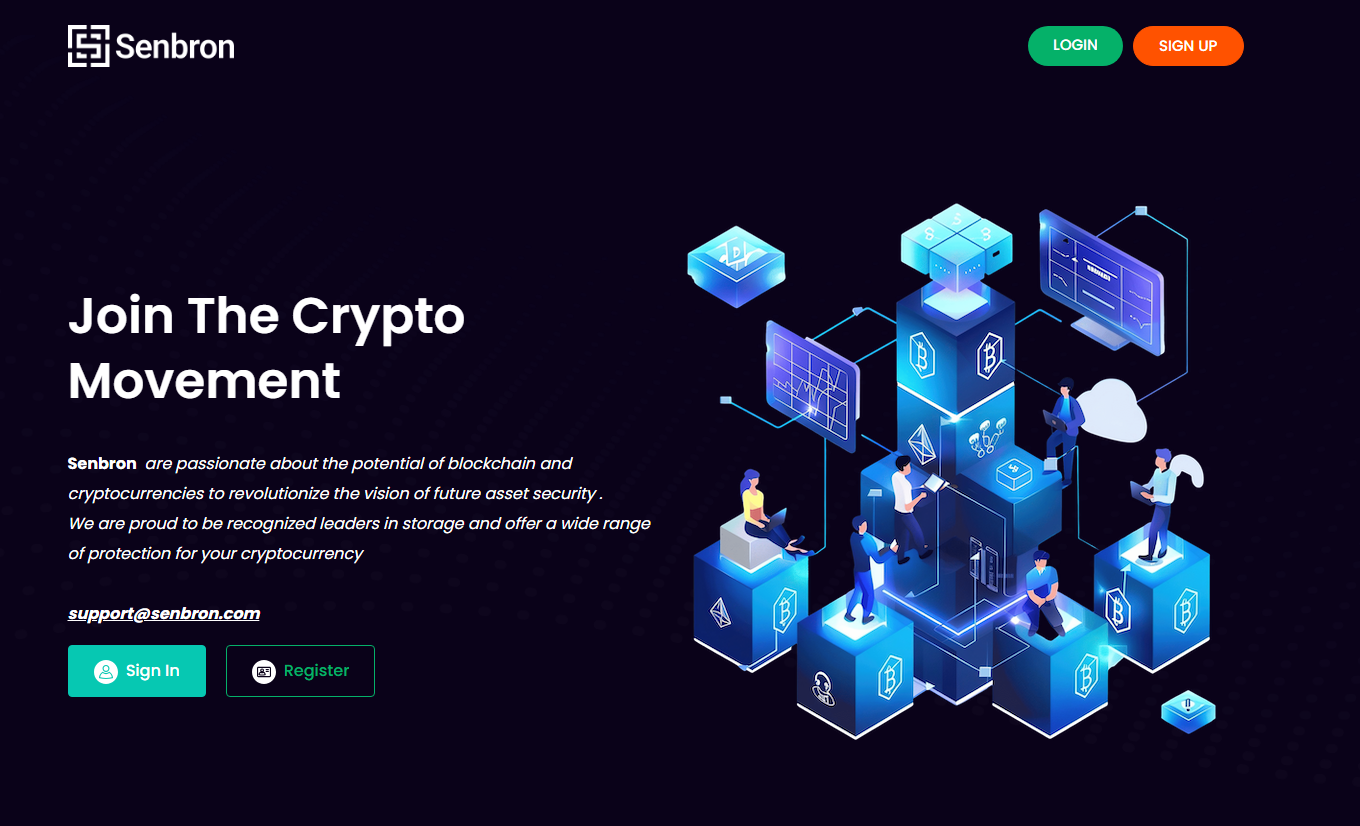 О Senbron, что это за компания, можно узнать на официальном сайте организации. Речь идет о криптовалютном кошельке, который появился совсем недавно и предлагает пользователям не только хранить деньги, но и осуществлять переводы внутри якобы надежной системы.