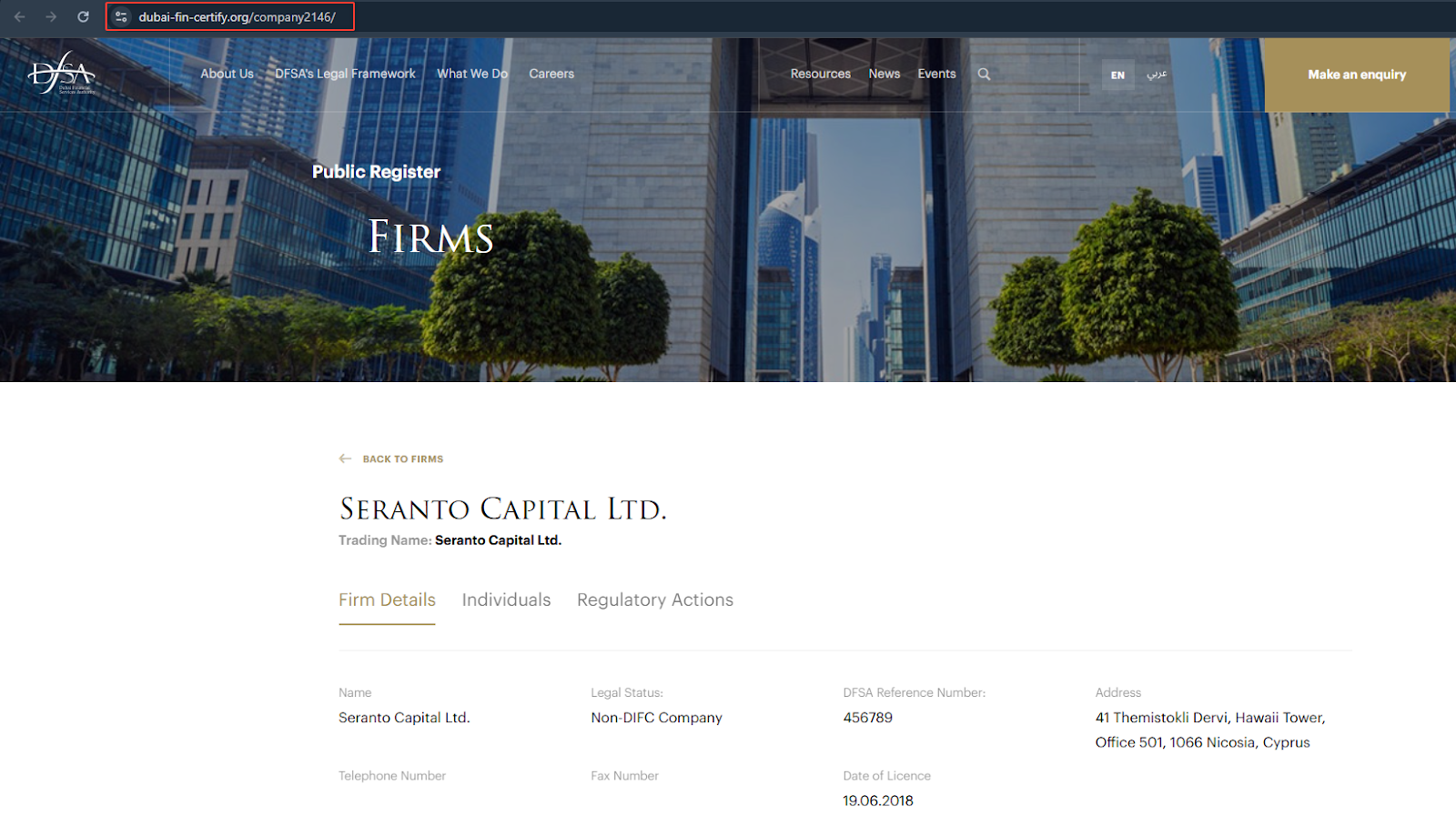 Изучая вопрос регулирования, мы заметили, что сертификаты брокера Seranto могут оказаться фейковыми, поскольку линки ведут не на страницы регуляторов. Например, представители организации заявляют о сотрудничестве с DFSA, но ссылка ведет на сайт dubai-fin-certify org, который не имеет никакого отношения к правительству Дубая.