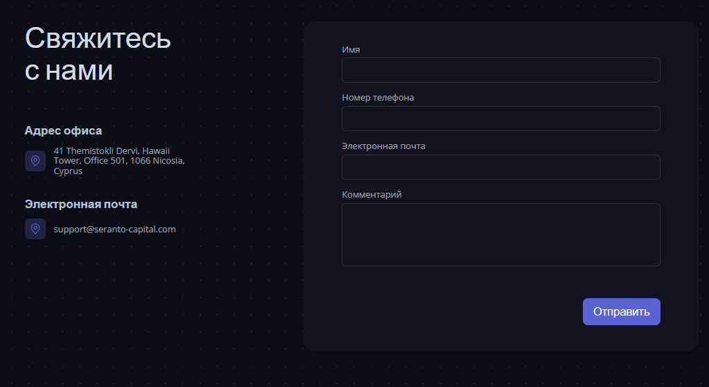 Написать представителям брокера «Серанто» можно через форму, представленную в одном из разделов сайта – понадобится подготовить сообщение, а также указать номер для контакта.