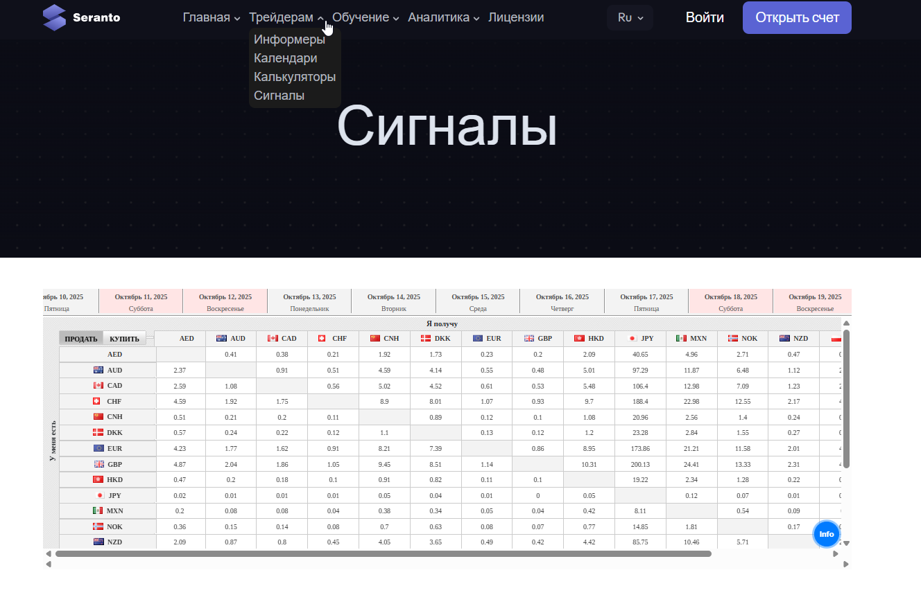 Брокер «Серанто» предлагает торговать инвестиционными активами: криптовалютой, акциями и сырьем, но нет полного списка доступных вариантов или пар. На сайте есть информеры, календари и сигналы для трейдеров – все это может потенциально упростить торговлю.