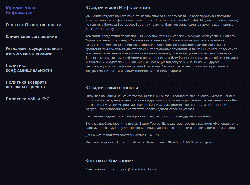 Компания брокера называется Seranto Capital Ltd, это название встречается в документах. Это позволяет заранее изучить, как организация поступит в тех или иных ситуациях, но нет гарантий, что описанные правила действительно будут соблюдаться.