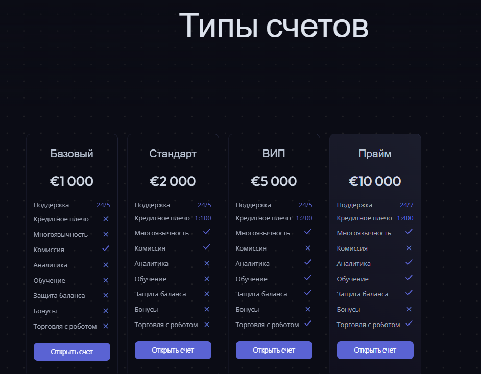 Минимальный депозит на сайте брокера Seranto выше, чем у конкурентов, так как необходимо пополнить баланс на сумму от $1,000. На этом тарифе не предусмотрено использование кредитного плеча, есть комиссии за сделки, но их размер не уточняется – также нет информации по спредам и другим опциям. Прайм-аккаунт отличается большими возможностями, отсутствием сборов и доступом к торговым ботам, а также обучению от специалистов сервиса.