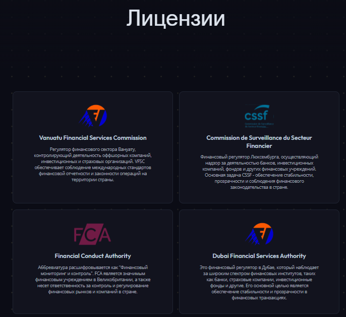 Где это интересно у брокера имеются четыре лицензии что-то когда по ссылкам переходишь перекидывает только на неофициальные страницы регуляторов и такая ситуация наблюдается со всеми лицензиями. Походу сертификаты то все фейковые. Небезопасные операции приведут только походу к потере денег.