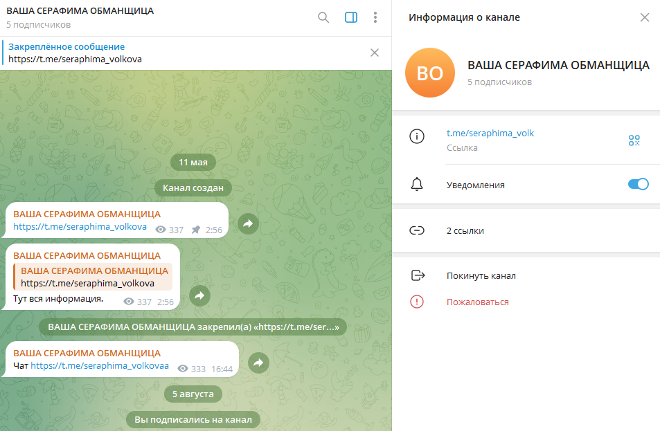 Вероятнее всего, имя Серафима Волкова для Тг-канала было вымышленным. Не исключено, что девушка продолжает вести работу, но уже с новыми данными.
