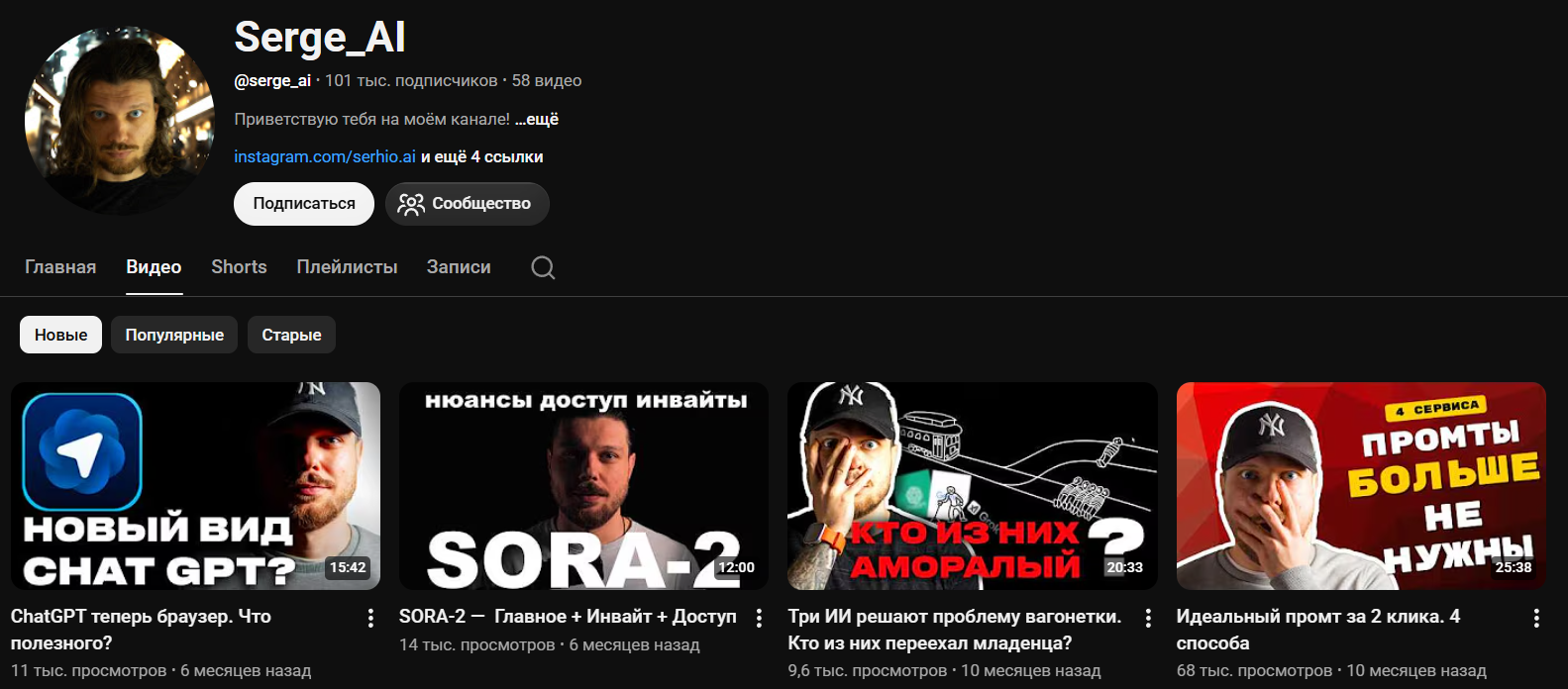 Также тут есть ютуб-канал Serge ai, где удалось набрать более 100 тысяч подписчиков. Всего тут опубликовано 58 роликов на тему нейросетей. В последние полгода контент не обновлялся. Было набрало более 4,6 миллионов просмотров. Площадка существует с июля 2023 года. Комментарии открыты.