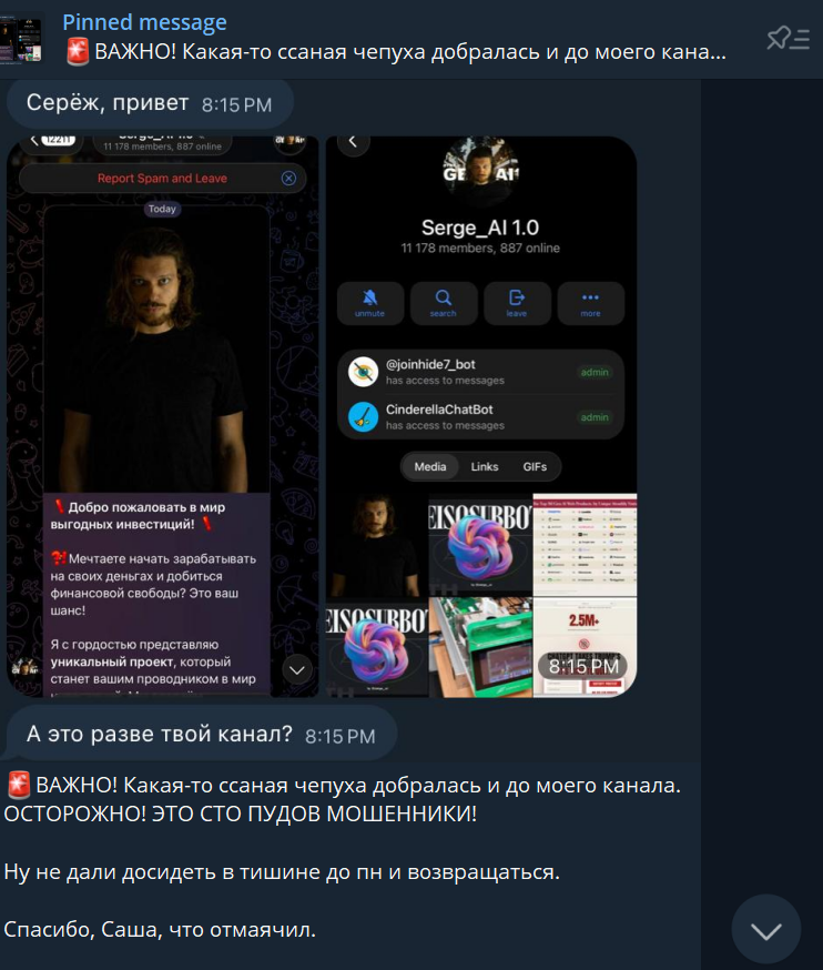 На площадках Serge ai 1. 0, если изучать их более детально, инвестиции упоминаются только в рассмотрении различных проектов, связанных с искусственным интеллектом. Здесь автор не убеждает пользователей вкладывать в какой-либо бизнес или проект, а просто рассматривает, сколько инвестиций получили развивающиеся ИИ-платформы. В таком случае может возникнуть вполне логичный вопрос – а является ли инвестором Serge ai. Рассматривая посты на канале можно проследить откуда появилась эта идея. Автор утверждает, что до него добрались мошенники и под видом его проекта создают различные чаты и ТГК, которые предлагают инвестировать. Он отрицает любую связь с ними.