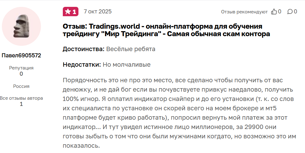 На независимых интернет-площадках в негативных отзывах говорится, что TradingsWorld com – мошенники, а соответственно, и вся деятельность Чистого – развод. Люди отмечают, что цель там только выманить деньги и не дать обещанного результата. Возвращать же оплату за услуги не хотят, по мнению комментаторов.