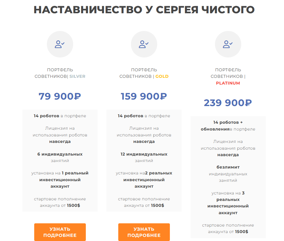 Основное же предложение трейдера Сергея Чистого – платное обучение и сопровождение по установке и применению торговых роботов. В рамках такого наставничества доступно три тарифных плана: