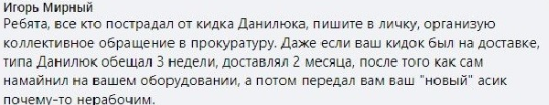 Игорь Мирный также подтверждает развод клиентов со стороны Данилюка, он намерен обратиться в прокуратуру с коллективным заявлением.