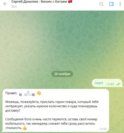 У селлера также есть бот под названием «Сергей Данилюк – бизнес с Китаем». Робот помогал пользователям заказывать товары из КНР с выбором конкретных условий доставки.