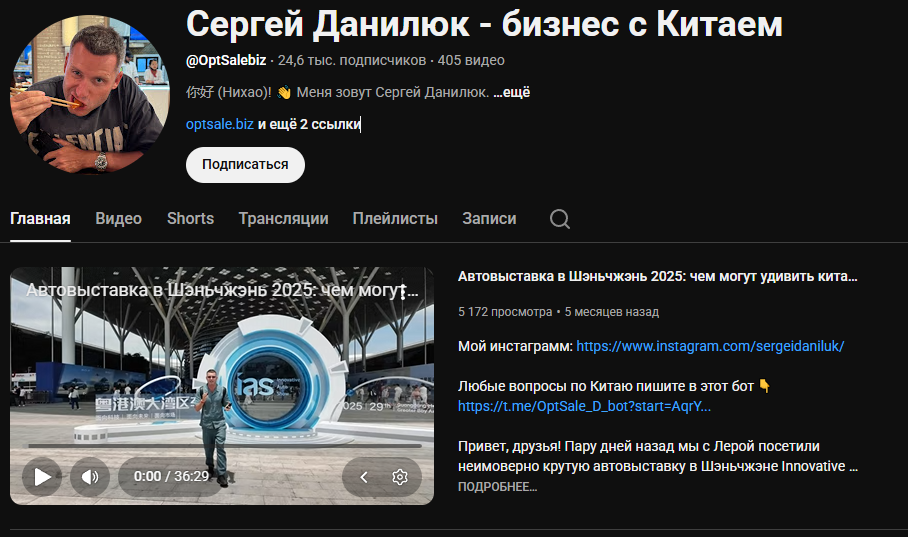 Пользователи на конец ноября 2025 года оставляли отзывы о канале «Сергей Данилюк из Китая» с ником OptSaleBiz. Проект был создан для транслирования новых бизнес-идей, актуальных для КНР, на аудиторию в чуть менее 2 500 пользователей.