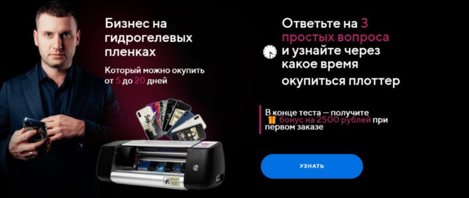 В Интернете удалось найти скрин с сайта Сергея, где он предлагал обучение по бизнесу на гидрогелевых пленках, который окупится за 5-20 дней. Вероятно, селлер продвигал маркетплейс для заказа товаров из Китая и предлагал своим подписчикам бонус в ₽2,500 на первый трейд.
