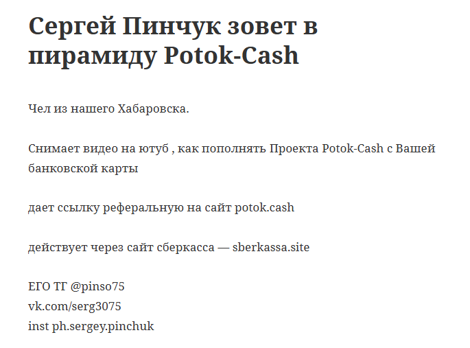 Автор преподносит свои предложения как источник пассивного дохода, заработка онлайн. На деле же Сергей является рефоводом весьма опасного проекта – Поток Кэш: