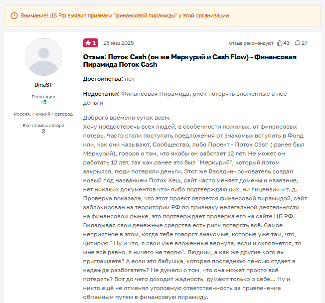 Поток Cash – проект, который позиционируется как касса взаимопомощи. На деле же он имеет признаки пирамиды, за что и был внесен в черный список Центробанка. Создателем данной платформы является некий Дмитрий Васадин. Поток Cash также известен как Меркурий и Cash Flow. Ребрендинг во многом связан с получением негативной репутации.