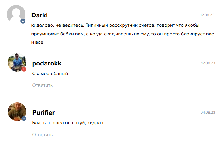 - после перевода средств автор блокировал клиентов, что подтверждается отзывами и говорит о намеренном прекращении контакта;