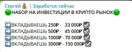 Обещания Сергея превратить 250 рублей в 33 000 за день — чистый бред! Никаких доказательств успеха, только пустые слова и липовые видеоотзывы. Перевод денег на личную карту без гарантий — явный развод для наивных. Не ведитесь на этот скам!