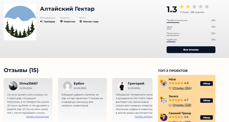 Однако, много отрицательных мнений есть в сети о компании “Алтайский гектар” в плане инвестиций. Вкладчики очень недовольны результатами.