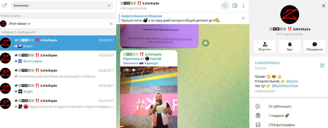 Прослеживается связь Зинченко с Тг каналом Zykov, автор которого Кирилл Зыков. Мы нашли у него 5 ссылок на личный профиль Сергея, но все они еще за 2017 год. Возможно, это был взаимный пиар, так как у Zykov слишком мало подписчиков для того, чтобы быть рекламной площадкой.