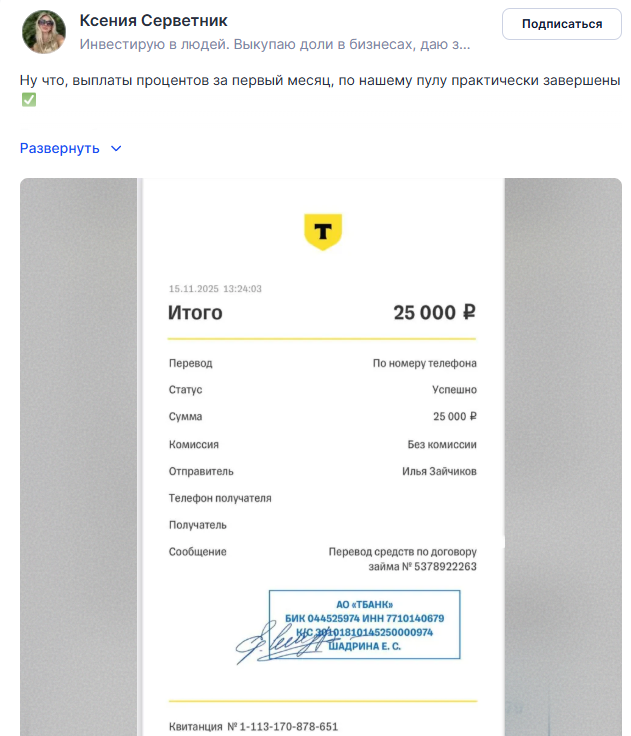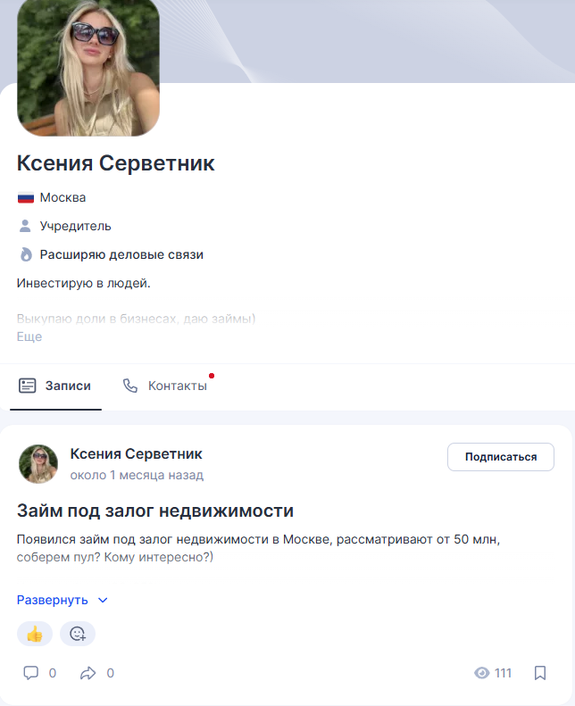 Основная деятельность инвестора Ксении Александровны Серветник связана с привлечением средств подписчиков в коллективные пулы. Девушка время от времени публикует в Tenchat новые сборы на объекты в Москве, на Бали и в других странах. В профиле указано, что Ксения занимается выкупом долей в бизнесах, предоставляет займы и формирует инвестиционные пулы. В ленте также выкладываются скрины с отчетами о крупной прибыли. Но такие картинки можно легко подделать.