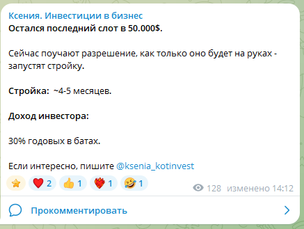 Дополнительно инвестор предлагает вложения в отдельные проекты, включая строительство и гостиничный бизнес. В этом случае минимальный вход может составлять от $10 000.