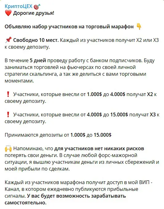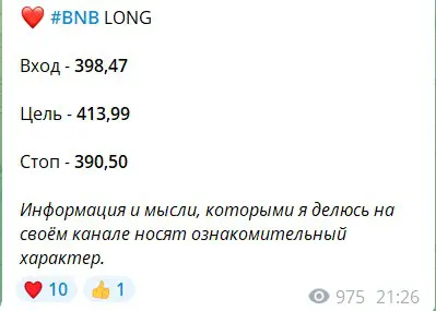 На канале публиковали криптовалютные сигналы. Выглядит неплохо, но без пояснений — это не аналитика. Да и приписка в конце дает определенные выводы. Администратор боится ответственности перед аудиторией.