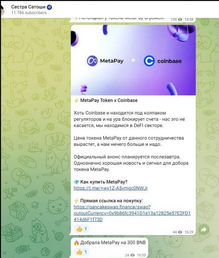 Проект Сестра Сатоши был лишь частью масштабной сетки одинаковых каналов. Они в один момент начали рассказывать про MetaPay. Суммарный убыток не раскрывается, но обычно после таких прогревов пользователи суммарно теряют около 200-300 тысяч долларов.