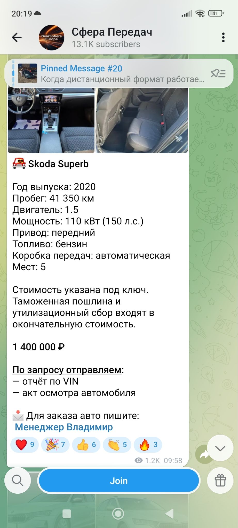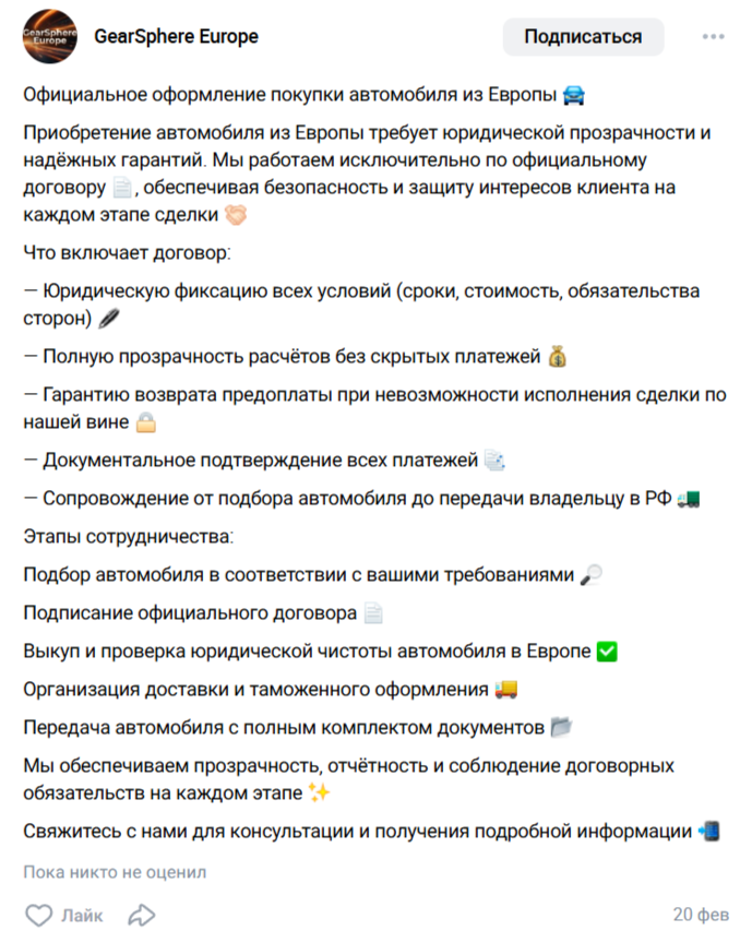 Проект «Сфера Передач» помогает клиентам приобрести автомобиль из Европы. Владельцы телеграм-канала обещают, что данная процедура пройдет быстро, надежно и без лишних хлопот. Заявлено, что в обязанности компании входит следующее: