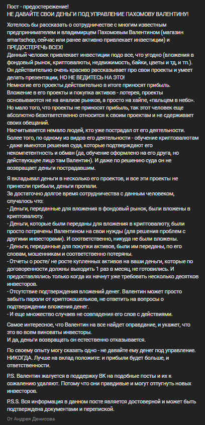 О деятельности Пахомова в целом представлены не самые позитивные отклики. Его инвестиционные проекты связывают с обманом. Некоторые пользователи заявляют, что и в бизнесе автор не всегда играл честно.