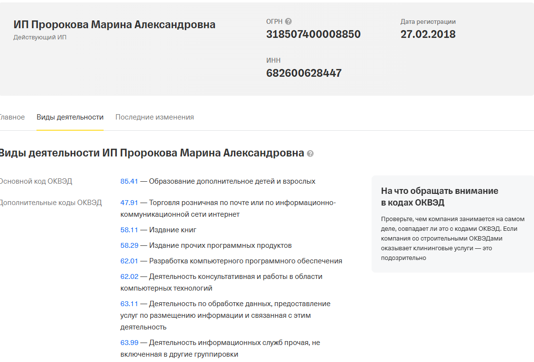 Дополнительно отметим, что школа зарегистрирована на ИП Пророкову Марину Александровну. В списке ОКВЭД есть необходимые, в том числе и для образовательной деятельности: