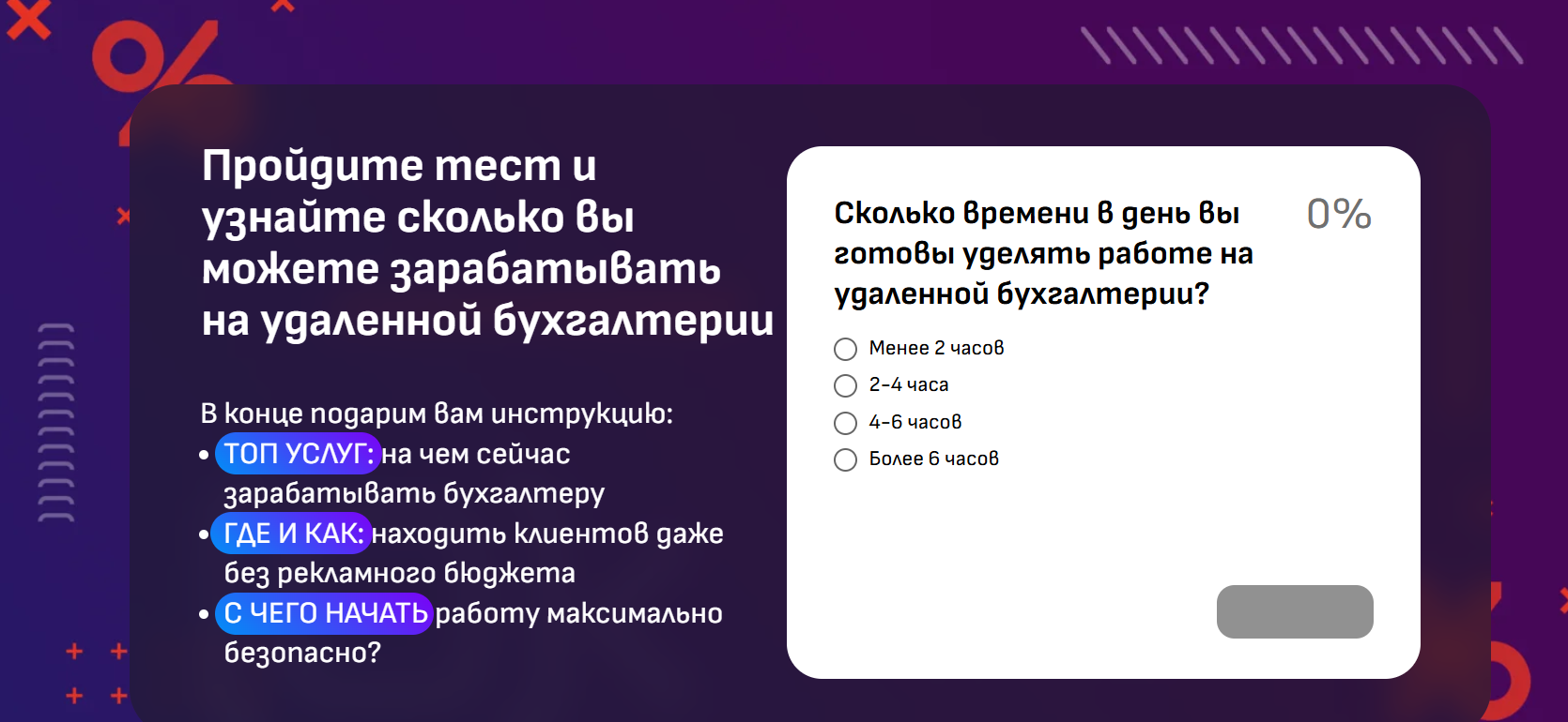 Есть у Ольги и второй сайт olga krasnova school ru. Его посетителям предлагают пройти тест на то, сколько выйдет зарабатывать на удаленной бухгалтерии. Для получения результатов нужно оставлять личные данные в форме обратной связи. Скорее всего, сайт был создан для дополнительного набора клиентов. Помимо сбора данных о потенциальных учениках другой функции он не выполняет.