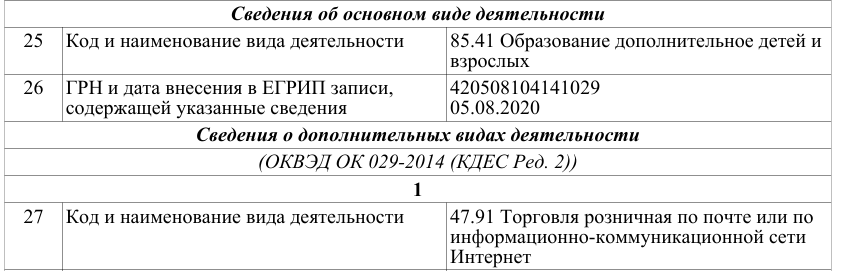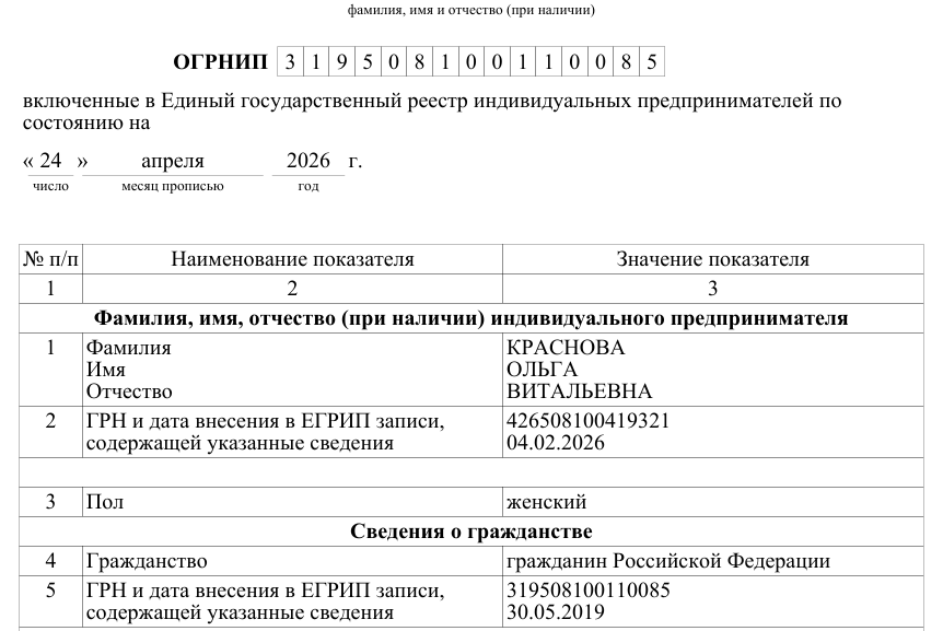 Ольга оформлена в качестве индивидуального предпринимателя. Была внесена в ОГРНИП 30 мая 2019 года. Согласно выписке, имеет право на образовательную и торговую деятельность.