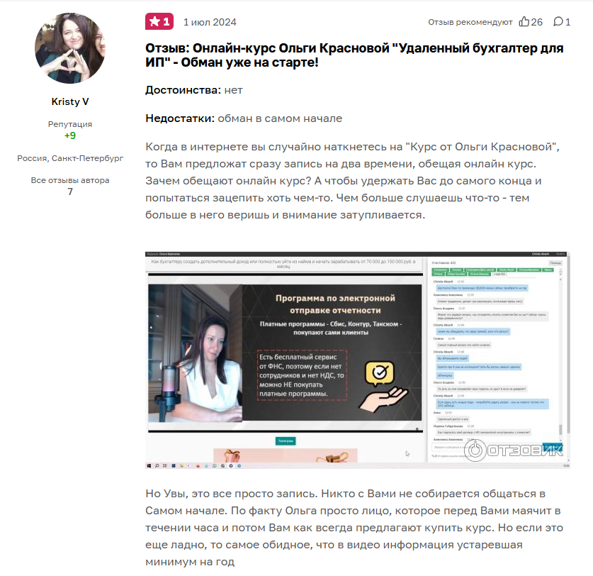Реальные ученики обычно остаются недовольны курсами. Жалуются, что на бесплатных вебинарах Ольга ведет активную рекламу своих платных курсов. Более того, предоставляет видеозапись, а не ведет реальный эфир, как было заявлено. Также отмечают, что платные образовательные программы Красновой содержат бесполезную устаревшую информацию.