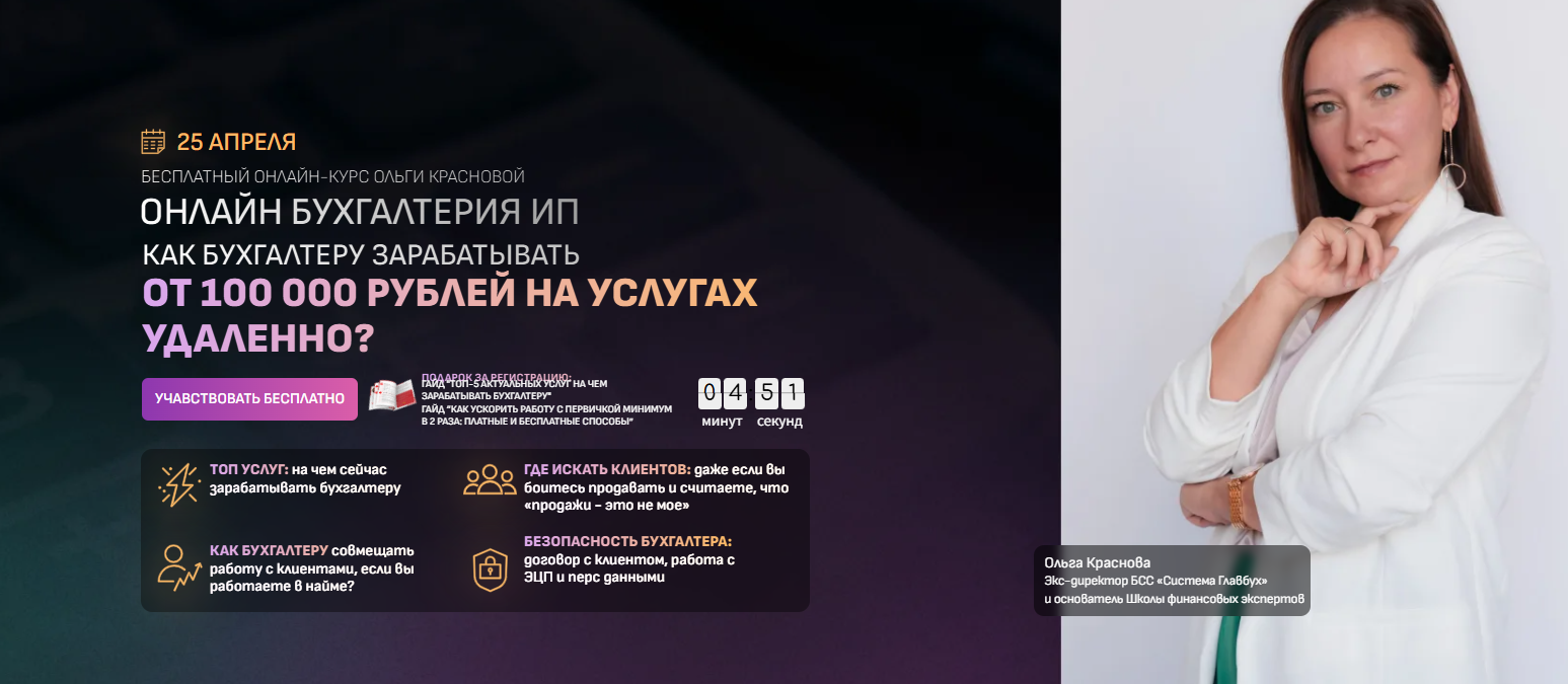Больше всего Ольга Краснова рекламирует свой онлайн курс по 3 ндфл и удаленный бухгалтер.