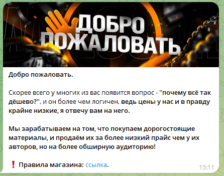 Разработчик бота объясняет низкие цены тем, что материалы якобы закупаются дорого, а продаются массово по сниженной стоимости. Фактически предлагаются схемы без подтвержденной эффективности, а их результат зависит от знания технических инструментов и правовых последствий, которые авторы не раскрывают.